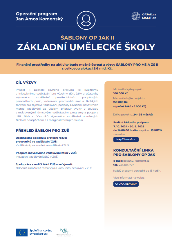 Základní umělecká škola Velké Opatovice se ve školním roce 2025/2026 opět zapojila do operačního programu Jan Ámos Komenský prostřednictvím projektu s názvem: